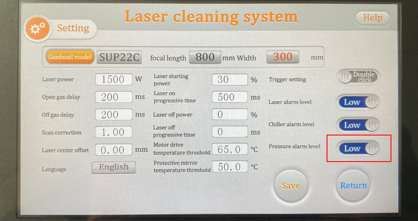 After the machine switches from welding mode to cleaning mode, a pressure alarm will be displayed on the machine’s control panel during operation.